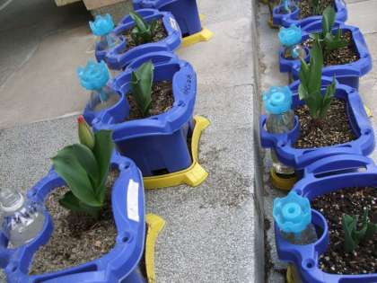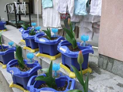 一年生が育てているチューリップの蕾が、色づき始めました。