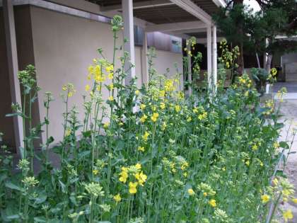 給食室前の花壇の菜の花も、黄色い花が咲き始めています。