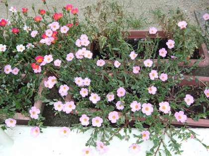 きびしい日差しの中、日日草やポーチュラカの花が色とりどりに