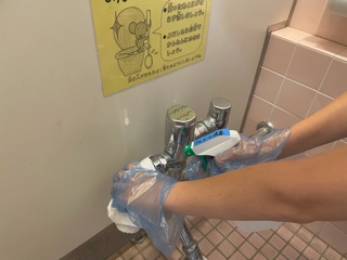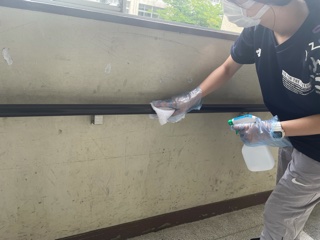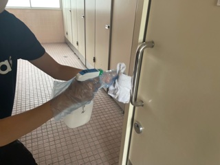 廊下や階段の手すり、トイレ等の学校のあらゆる場所を消毒しています。