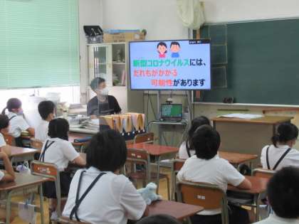 児童集会での校長先生からの講話は、新型コロナウイルスから健康を守ろうというお話です。