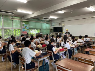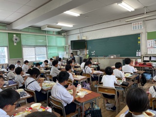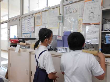 毎日、給食時には、保健委員会が給食のメニュー紹介の他、給食時のマナーや大切にすべきこと等について、全校放送をしています。