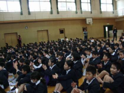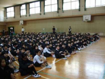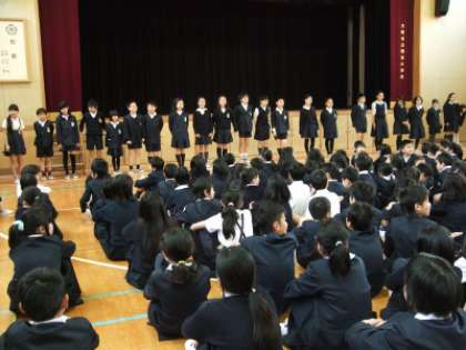 きょうの児童集会は、前期学級代表や各委員会委員長が全校児童の前で