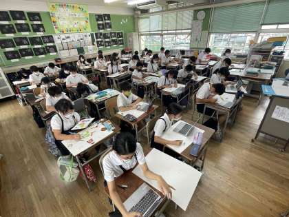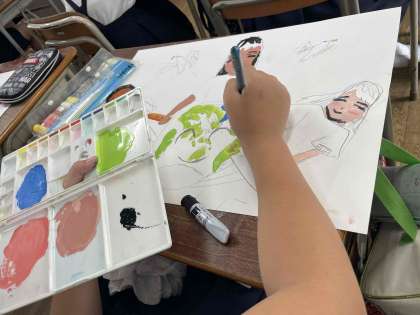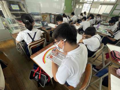 6年生は、図画工作科の学習で平和のポスターを描いています。テーマは「みんなつながっている」。