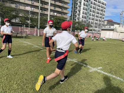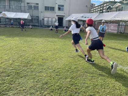 6年生の運動会の競技は、リレーとタグ取り合戦。今日はタグ取り合戦の練習をしました。例年で言う騎馬戦に代わる競技となります。教職員にとっても初めての競技になるので、子ども達が楽しめるように、子ども達と共にルールを考えながら何度も何度も練習を重ねてきました。