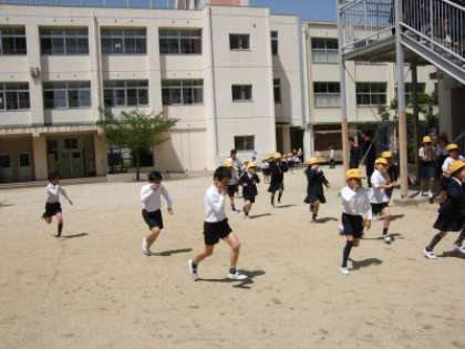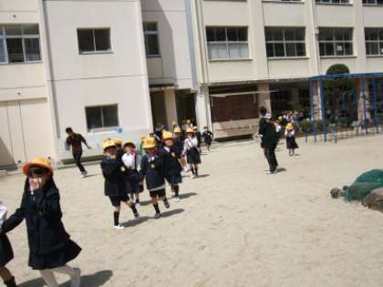 非常ベルが鳴り、訓練放送のあと速やかに運動場へ避難しました。