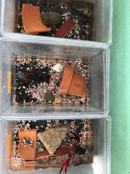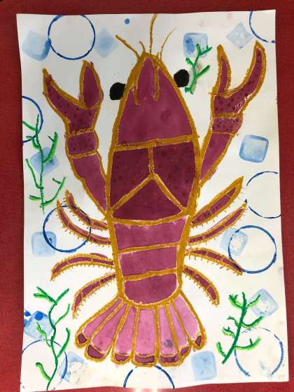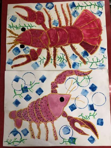 2年生は、ザリガニを描きました。1学期から飼っていたザリガニを思い出し、端末で調べ画用紙に表現しました。