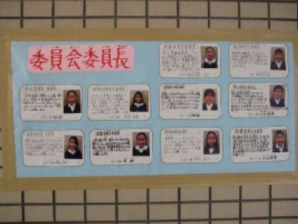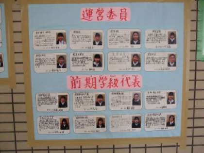 玄関に運営委員や前期児童会の委員・委員会委員長の抱負を書いた