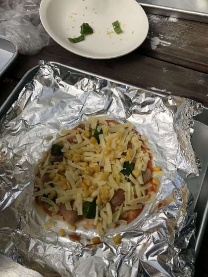 トッピングのピーマン、ウインナーを班で協力して切りました。その後、伸ばした生地に、ピーマン、ウインナー、マッシュルーム、コーン、チーズの中から好きなトッピングを乗せました!盛り盛りのトッピングになった子も、、、