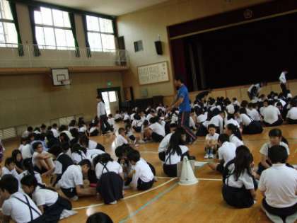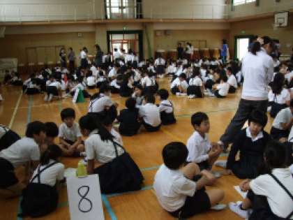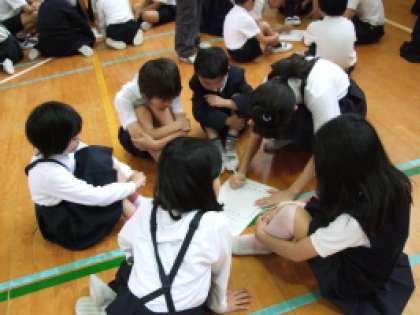 きょうの児童集会は、22日(金)予定されている全校遠足のたてわり班活動の旗のデザインをみんなで考えました。