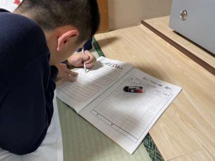 就寝準備をしています。1日の振り返りの旅日記も。22時には消灯です。