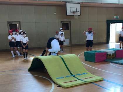 「開脚跳び」「台上前転」「かかえこみ跳び」といった3つの跳び方に挑戦しています。跳び箱やマットの設置の仕方等、学習の場もいろいろ工夫しています。