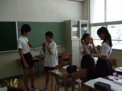 運動の前と後の1分間の脈拍回数のちがいを調べたり、聴診器で