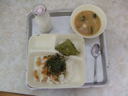 きょうの献立は、かやくご飯・みそ汁・抹茶ういろう・牛乳です。