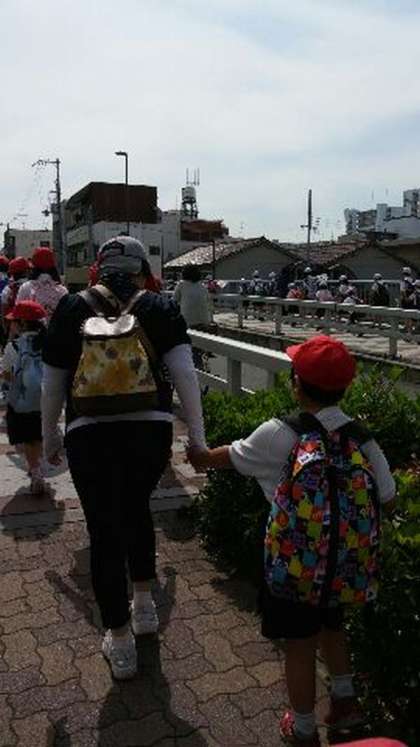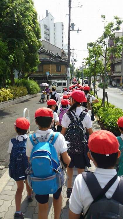 学校から目的地である鶴見緑地までは、異学年グループ(1〜6年生混成)で徒歩で移動します。ただし、引率の教職員や保護者ボランティアを含めると、400人以上が一斉に動きますので、全体を半分に分け、道路の左右に分かれて移動します。