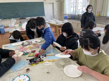 木製の駒、糸引き駒に子どもたちは思い思いに絵付けや色付けのデザインをします。紙皿のフリスビーにも、色着けや絵着けをします。