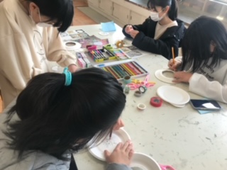 絵の具やペンも全て準備してくださいました。子どもたちは、「何色にしよう」「桜の絵を描こう!」などと言いながら、自分だけのコマやフリスビーを作成することができました!