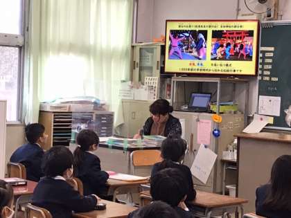 また、「1年間の気温のうつりかわり」のグラフから、2月がいちばん寒い月であることを話されました。また、大阪にすんでいる児童のみなさんにとって、雪はめずらしく降ってほしいと感じるけれど、雪が降る寒い土地に住む人々は、その雪と向き合い、工夫して暮らしていることについて紹介されました。