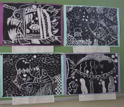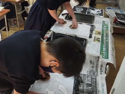完成をめざして、一人一人が彫刻刀の正しい使い方を守って、しゅぅ彫った後に、ローラーで黒インキを台板につけ、上から紙をのせてバランで擦って紙に刷っていきます。ドキドキの仕上げ段階ですが、子どもたちはできあった作品を見て喜んでいました。