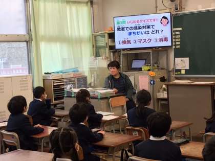 今日の校長先生からのお話は、「新型コロナウイルス感染症から健康を守ること」についてです。児童たちは、クイズ形式のお話を通して、コロナウイルスについて楽しく学びました。