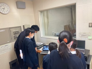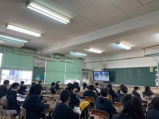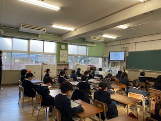 集会担当の児童は、タブレットのパワーポイントを使い、