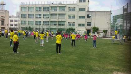 最初に芝生運動場で行われた開会式での連合町会長さん、学校長、PTA会長さんの挨拶に続き、さっそくその場で受付で配られたスポーツタオルを使った体操が始まりました。