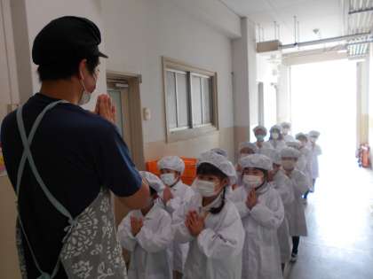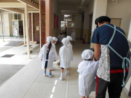 1年生では、各クラスの給食当番ががんばっています。