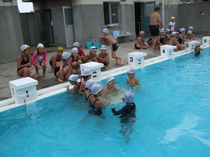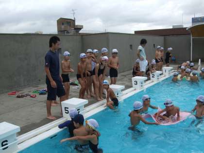 屋上プールへ上がる階段をのぼっていくと歓声が聞こえます。