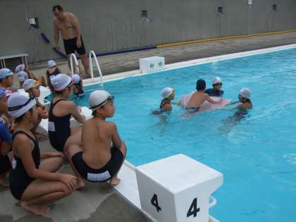 マットを引っ張る子は、水をかき分けて一生懸命水中を歩きます。