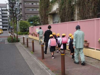 担任の先生や管理作業員さんと、通学路の安全を確かめながら歩いています。