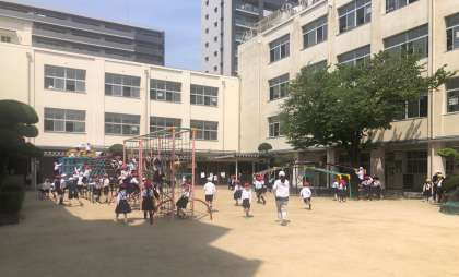 関目小学校の児童は、緑の芝生の運動場、ドッジボールコート、中庭で元気いっぱい遊んでいます。