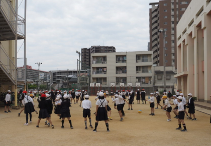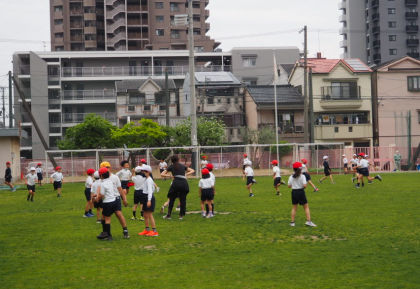 多少の曇り空ですが、たくさんの子どもたちが運動場で遊んでいます。
