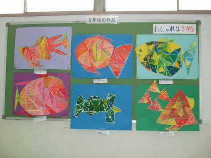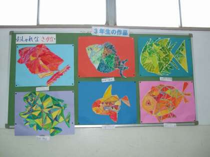 パスで魚をかき、体に線をひいて分けました。色は、黄色と赤・黄色と青