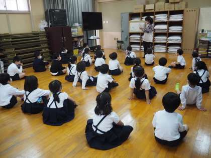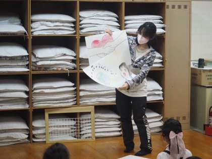 子どもたちが歌詞を覚えやすいように、音楽専科の教員が校歌を紙芝居にしたものを用いました。