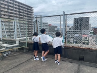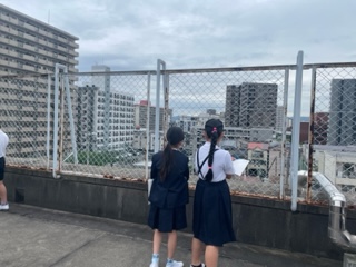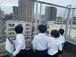 先日、小学校の屋上へ行き、自分たちが住んでいる町に何があるのかを調べました。
