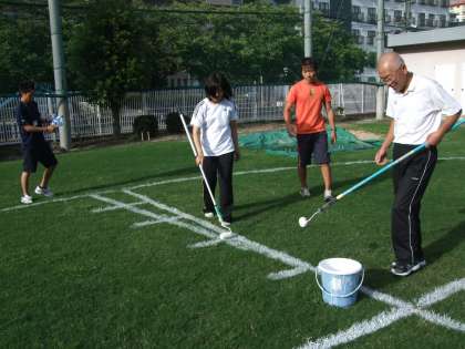 芝生にかわった年は苦労しましたが、最近は職員作業で手際よくライン引きを