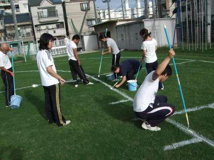 本校は、芝生の運動場のためラインパウダーは使えず、水性ペンキを薄めて