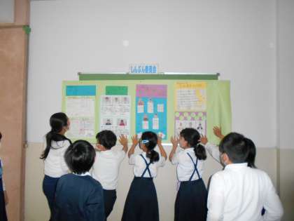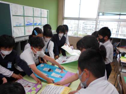 新聞委員会では、毎月の行事や先生紹介、関目クイズ、その他全校児童に関わりのある記事を書き、壁新聞にして、1階給食室横に掲示しています。