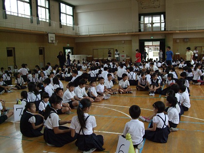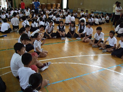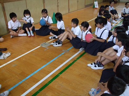 今朝の全校集会は、たてわり班でばくだんゲームをしました。