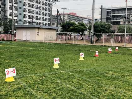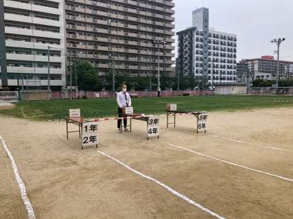 (4)芝生運動場の奥から1年1組から順に並んでいます。