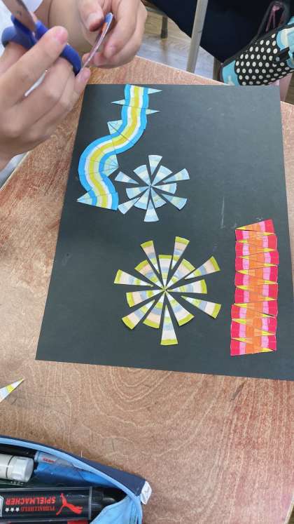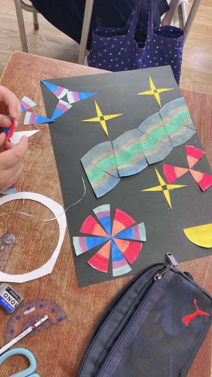 子どもたちは、コンパスで円を描き、鮮やかに色を塗って、切って、様々な工夫を凝らして組み合わせて貼り、月や川、太陽、花など、さまざまなものを表現しました。