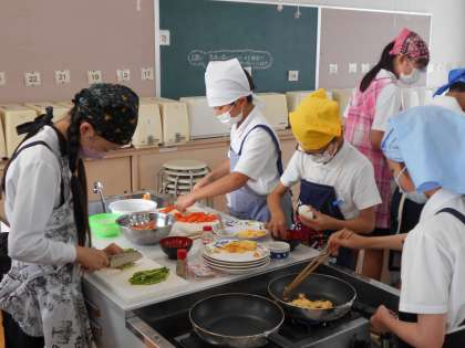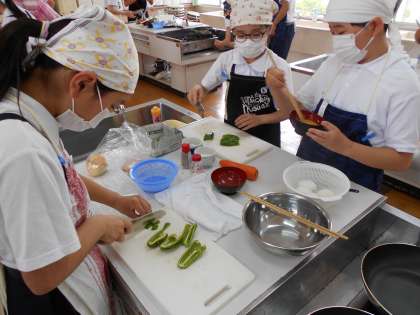 いろどり炒めでは、ニンジンの千切り、ピーマンの千切り、玉ねぎの薄切り、ハムは短冊切り、いろいろな切り方にチャレンジしました。