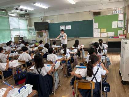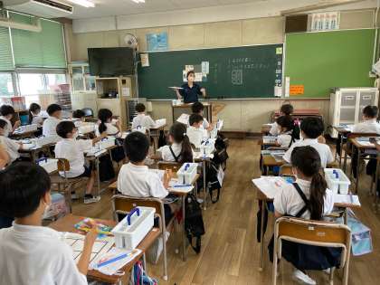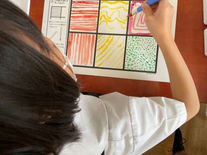 道具の名前や使い方を知り、その後は実際に絵の具を出して、線を引く練習をしました。初めは慎重に塗っていた子も、終わり頃には好きな色や柄を楽しそうに塗ることができていました!