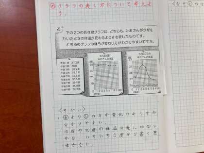 チームごとに2つのグラフの「ちがい」や「わかりやすいとおもったグラフとその理由」について、話し合いました。