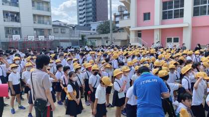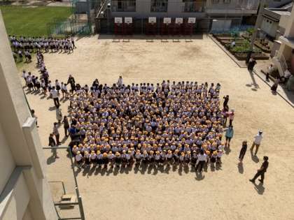 関目小学校の創立80周年を記念して、全体の集合写真、学年別の集合写真、人文字で校章を作る航空写真の3つの写真を撮影しました。