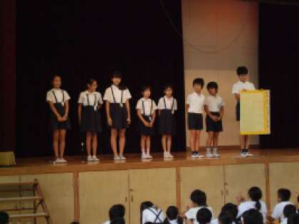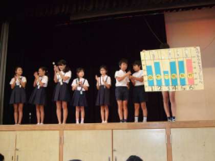 集会委員会のイントロクイズに続き、保健委員会によるキラキラチェックの結果発表がありました。第1位は、最高学年の6年生でした!おめでとうございます。