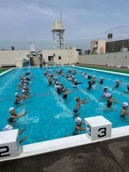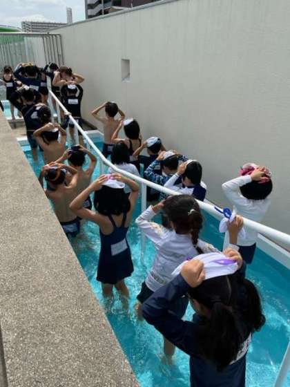 アヒル体操をして、水慣れとウォーミングアップをしています。