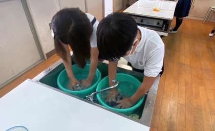 12日(火)に6年2組、15日(金)に6年1組が家庭科の授業で洗濯実習を行いました。