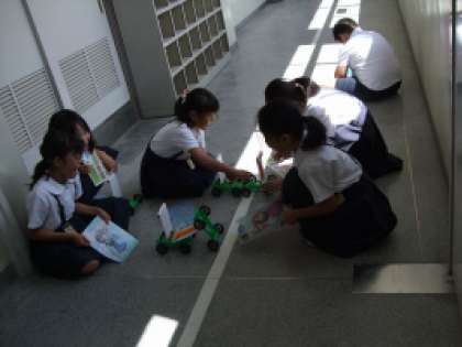 「風とゴムのはたらき」の学習で風で動く車を作りました。