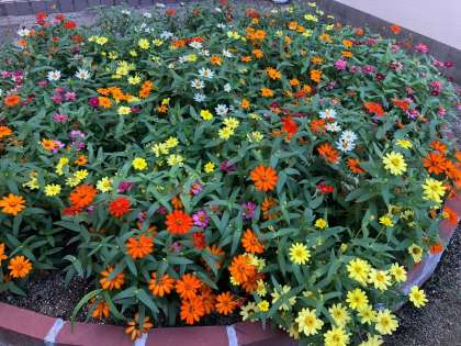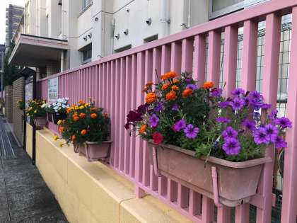 学校の玄関には、たくさんのきれいな花が咲いています。